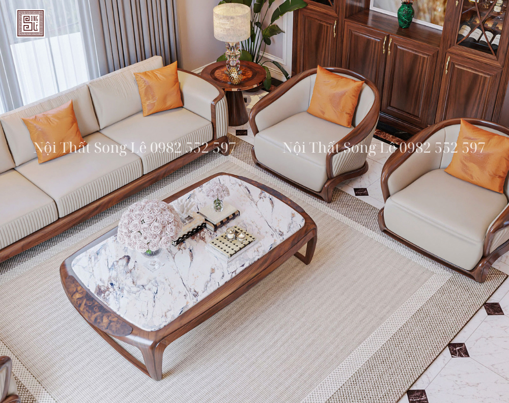 Bàn trà gỗ óc chó này được bố trí trung tâm giữa bộ sofa gỗ óc chó da cao cấp màu kem. Sắc nâu của gỗ óc chó từ bàn trà đồng điệu với kệ tivi và tủ rượu, tạo nên một tổng thể hài hòa, xuyên suốt.
