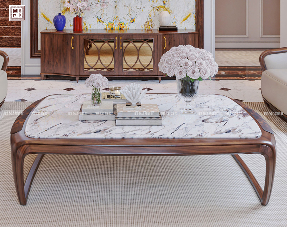 Khung bàn sử dụng gỗ óc chó tự nhiên với tông màu nâu chocolate ấm áp. Những đường vân gỗ cuộn xoáy đặc trưng hiện rõ trên bề mặt khung. Mặt bàn trà là sự kết hợp hoàn hảo với mặt đá trắng vân mây (Marble).
