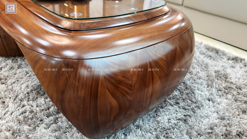 Bàn trà gỗ óc chó BTR014 gây ấn tượng mạnh nhờ lối thiết kế hiện đại, lược bỏ những góc cạnh sắc nhọn. Mặt bàn sử dụng khối gỗ óc chó nguyên tấm với bề mặt phẳng mịn, khoe trọn hệ vân nu cuộn sóng độc bản. Khung chân bàn trà được tạo hình nghệ thuật, uốn lượn tinh xảo. Thiết kế này tạo độ thoáng cho gầm bàn, giúp không gian phòng khách trông rộng và thoáng hơn rất nhiều so với các mẫu bàn chân đặc truyền thống.