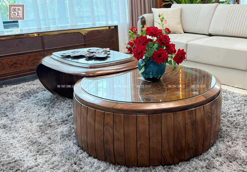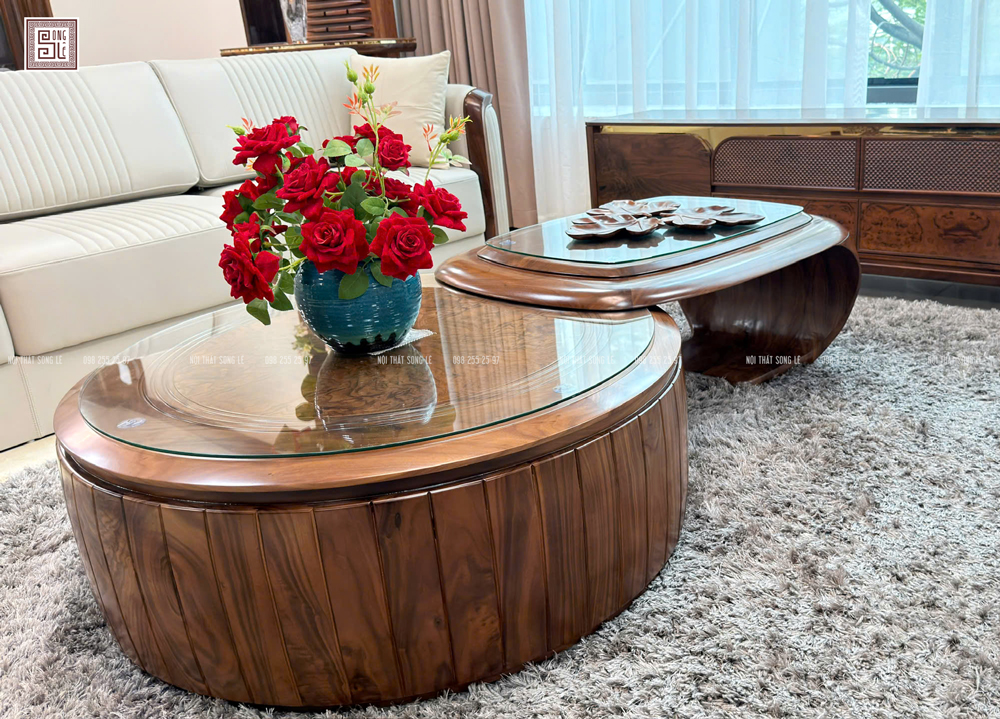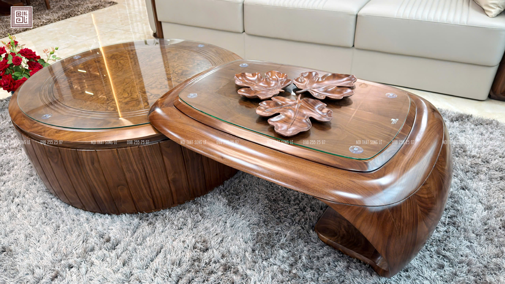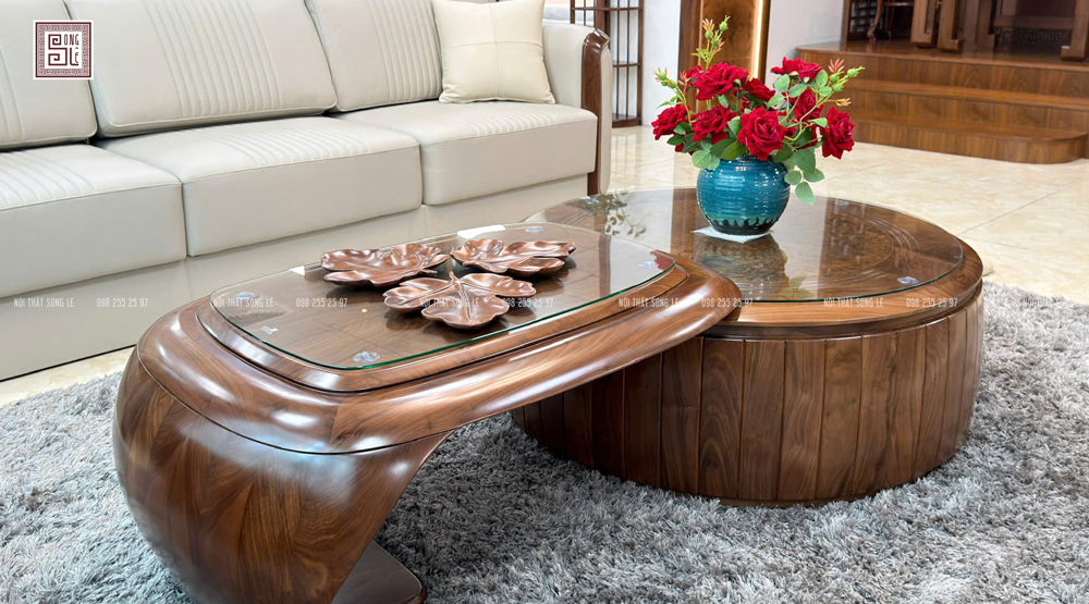 Bàn trà và bộ ghế sofa gỗ óc chó luôn là "bộ đôi" không thể tách rời. Song Lê có xưởng sản xuất nội thất quy mô tại Hà Nội, trực tiếp chế tác không qua trung gian, mang lại mức giá thực tế và sát gốc nhất cho khách hàng.