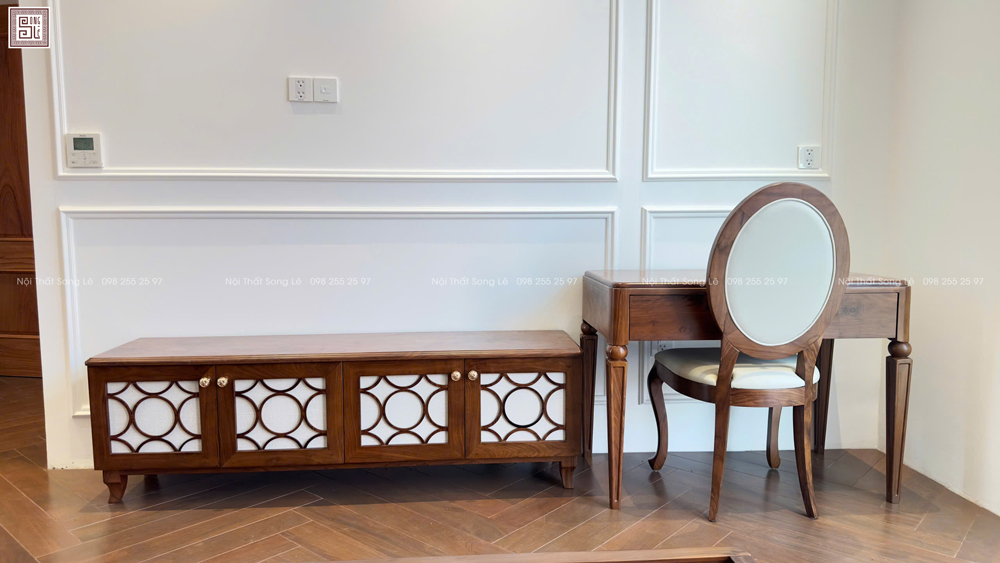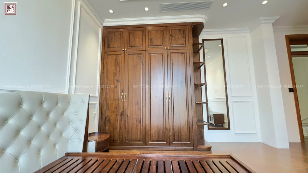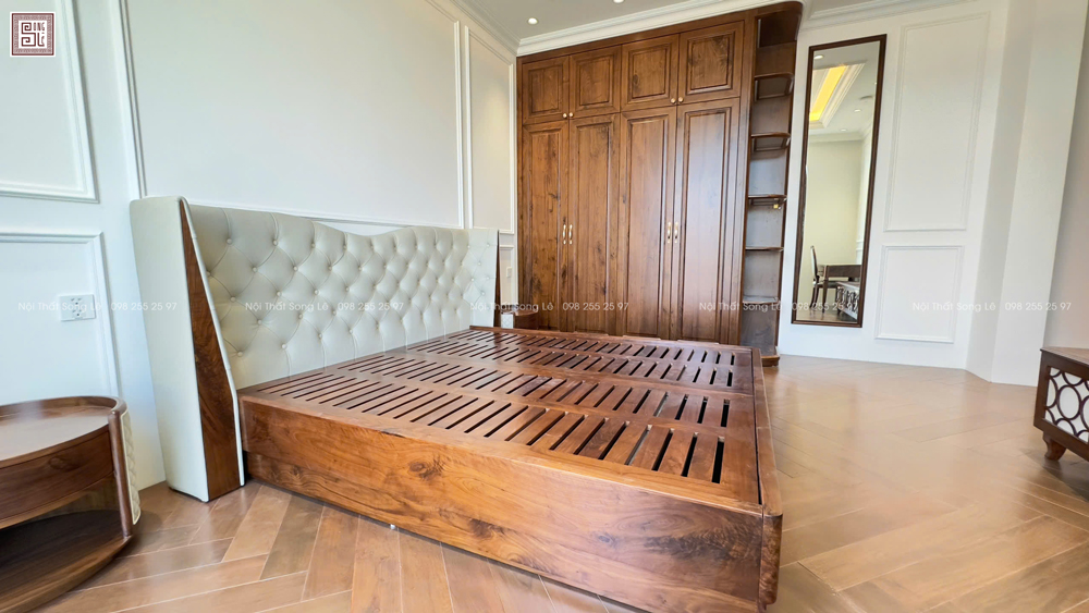 Phòng khách là nơi để tiếp đón bạn bè, thì phòng ngủ chính là khoảng trời riêng tư nhất. Trong căn phòng này mọi sự chú ý đều đổ dồn về chiếc giường ngủ gỗ óc chó SLGN068. Khác với những loại giường công nghiệp vuông vức đôi khi hơi cứng nhắc, chiếc giường này mang một vẻ đẹp rất "mềm". Cái hay nhất chính là các team thợ Song Lê đã tỉ mỉ bo tròn mọi góc cạnh, từ vai giường đến đuôi giường.