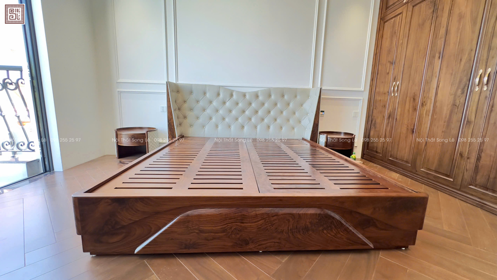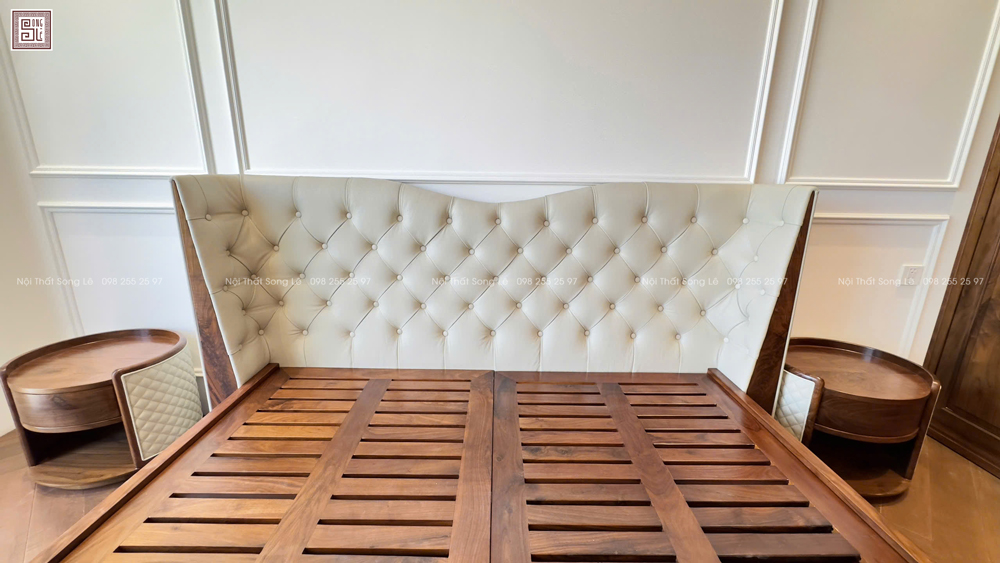 Phần đầu giường được bọc lớp da cao cấp êm ái với những đường chần trám tinh tế, vừa là điểm nhấn sang trọng, vừa là chỗ tựa lưng rất "vừa vặn" để đọc vài trang sách hay trò chuyện cùng nhau trước khi đi ngủ. Những vân gỗ tự nhiên uốn lượn trên mặt gỗ khiến chiếc giường không chỉ là món đồ nội thất mà còn là một tác phẩm nghệ thuật.