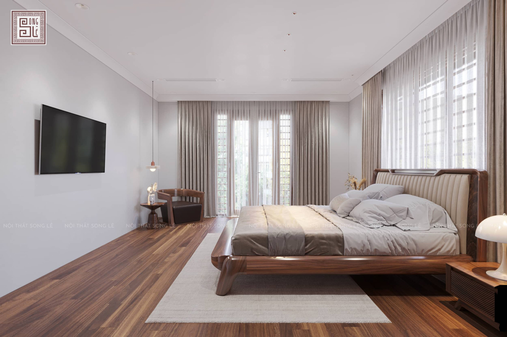 - Tủ quần áo rộng lớn: Được thiết kế kịch trần, biến mảng tường khô cứng thành một hệ lưu trữ phẳng phiu, sang trọng. Việc làm tủ sát trần giúp không còn vất vả leo trèo lau bụi bặm một chi tiết cực kỳ tâm lý.
