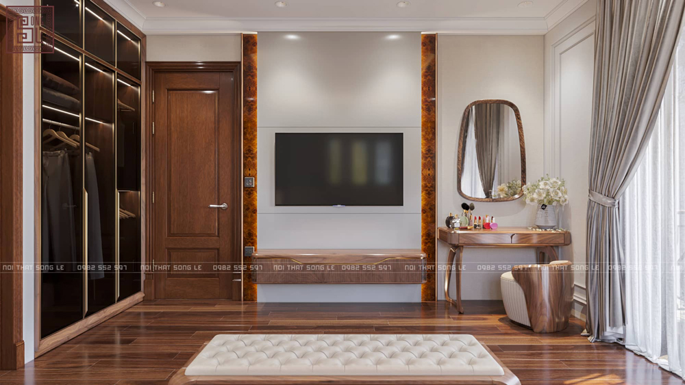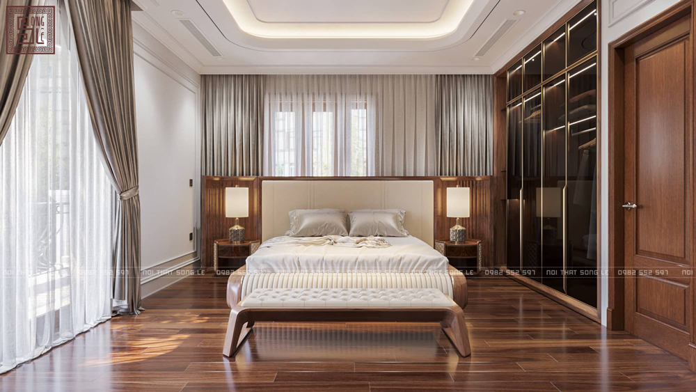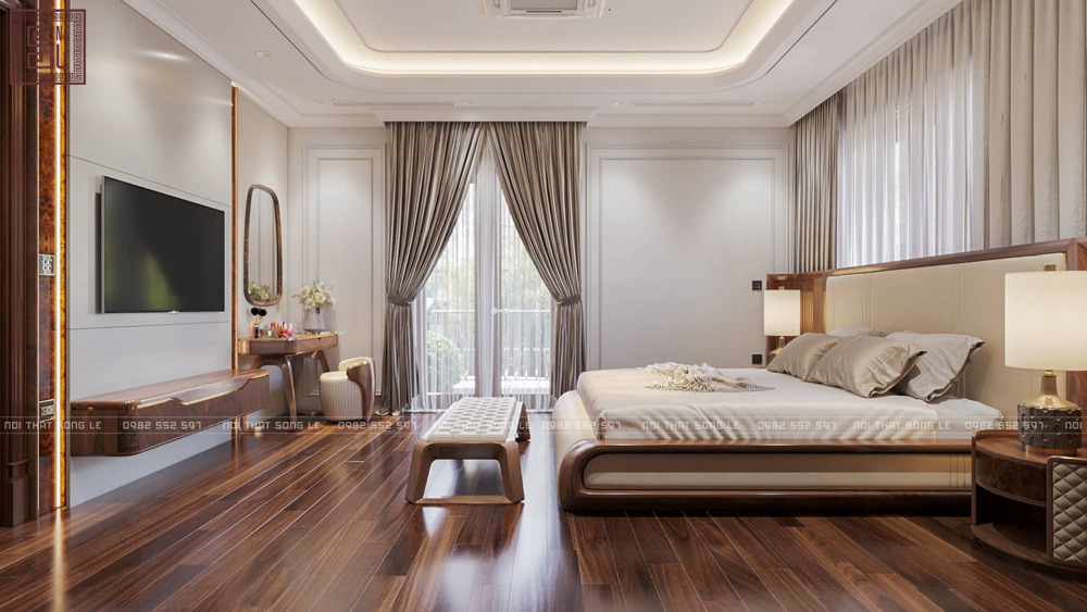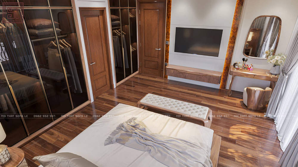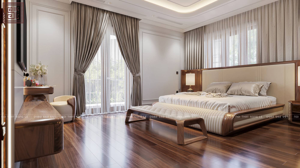 Để không gian phòng ngủ đạt được sự hài hòa và đẳng cấp, Song Lê luôn ưu tiên giải pháp thiết kế thi công nội thất gỗ óc chó trọn gói