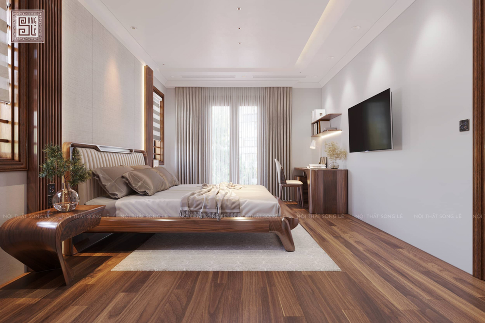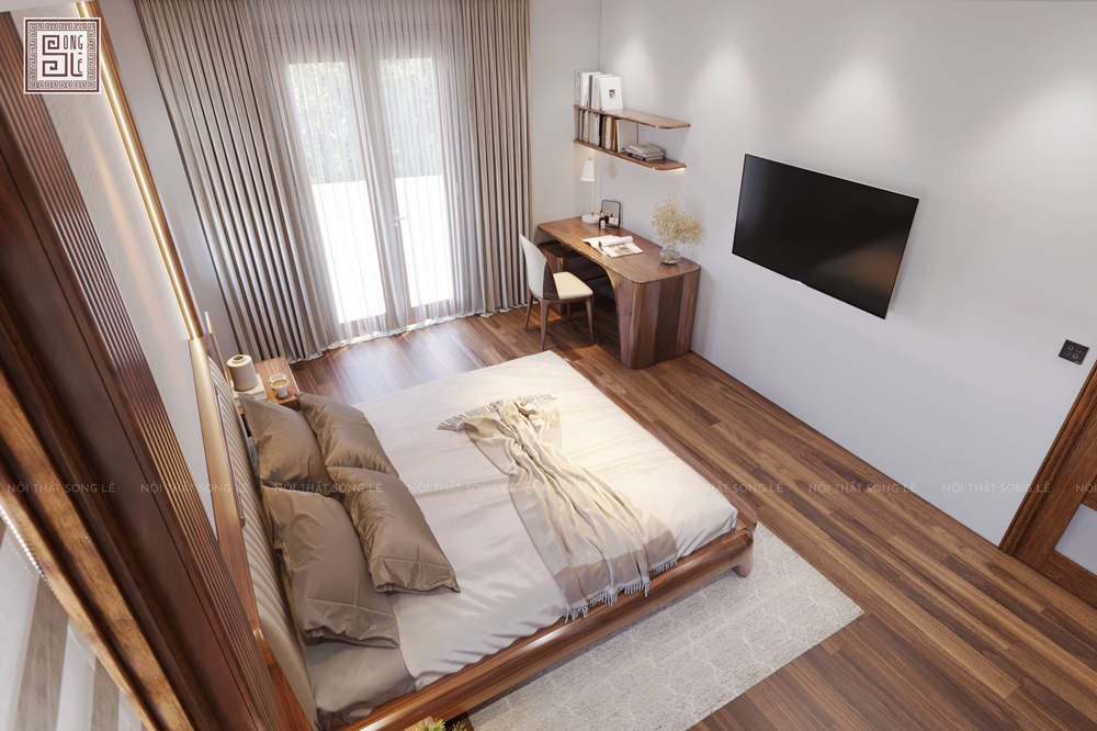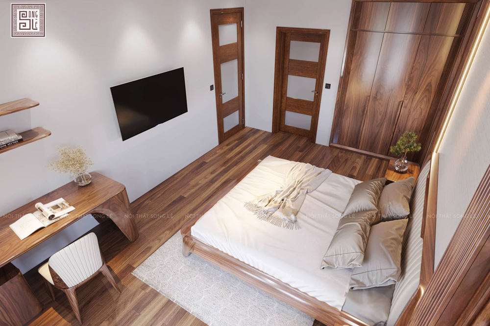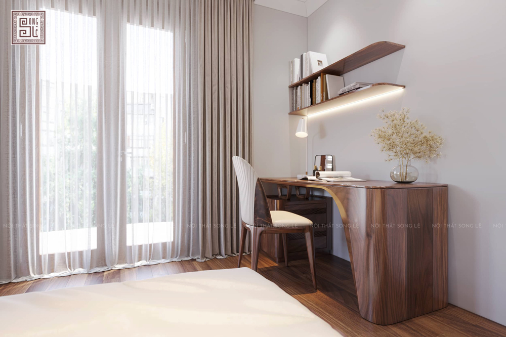 - Bàn làm việc đuôi giường: Việc đặt bàn làm việc ngay phía đuôi giường giúp tối ưu hóa không gian, tạo nơi để gia chủ có thể thong thả xử lý công việc nhẹ nhàng hoặc ngồi đọc sách mà vẫn giữ được sự kết nối trong phòng ngủ.