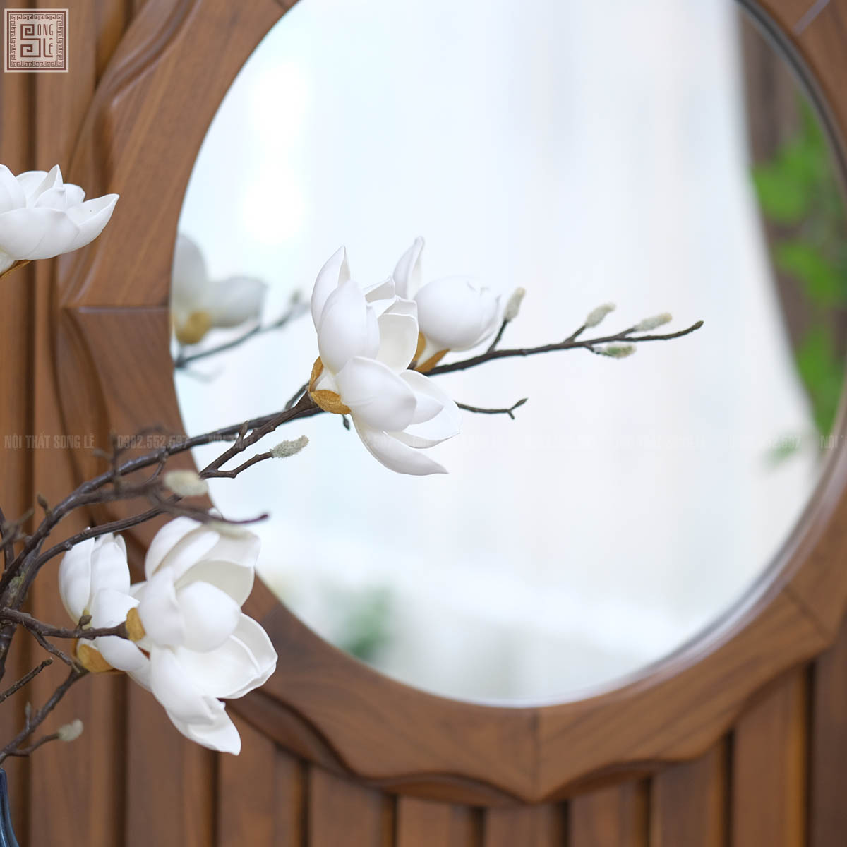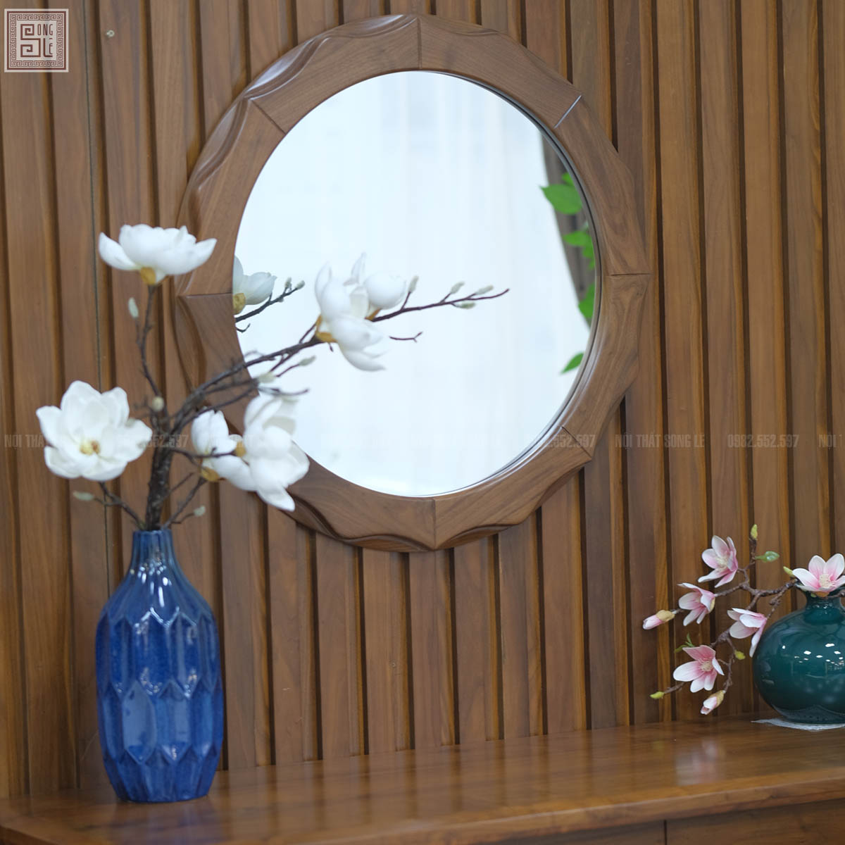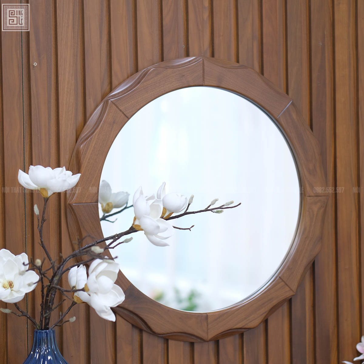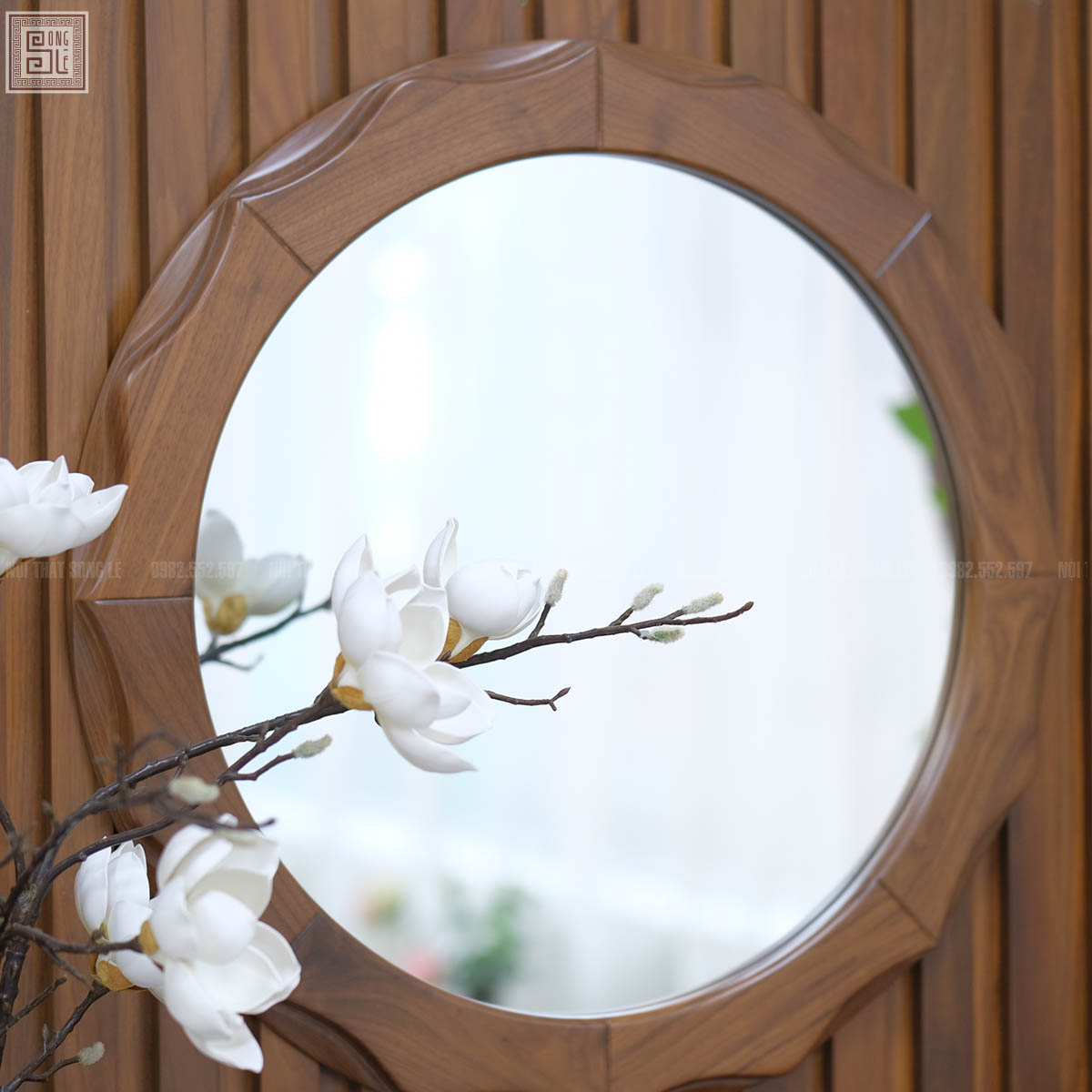Theo quan niệm phong thủy, gương tròn tượng trưng cho sự viên mãn, trọn vẹn và cân bằng năng lượng. Khi kết hợp với gỗ óc chó – loại gỗ quý mang nguồn năng lượng tích cực, chiếc gương trở thành vật phẩm mang lại sự hài hòa, may mắn cho gia chủ. Đặt gương ở những vị trí hợp lý như phòng khách hoặc lối đi sẽ giúp thu hút tài lộc, tạo cảm giác thông thoáng và cân bằng khí trong nhà.