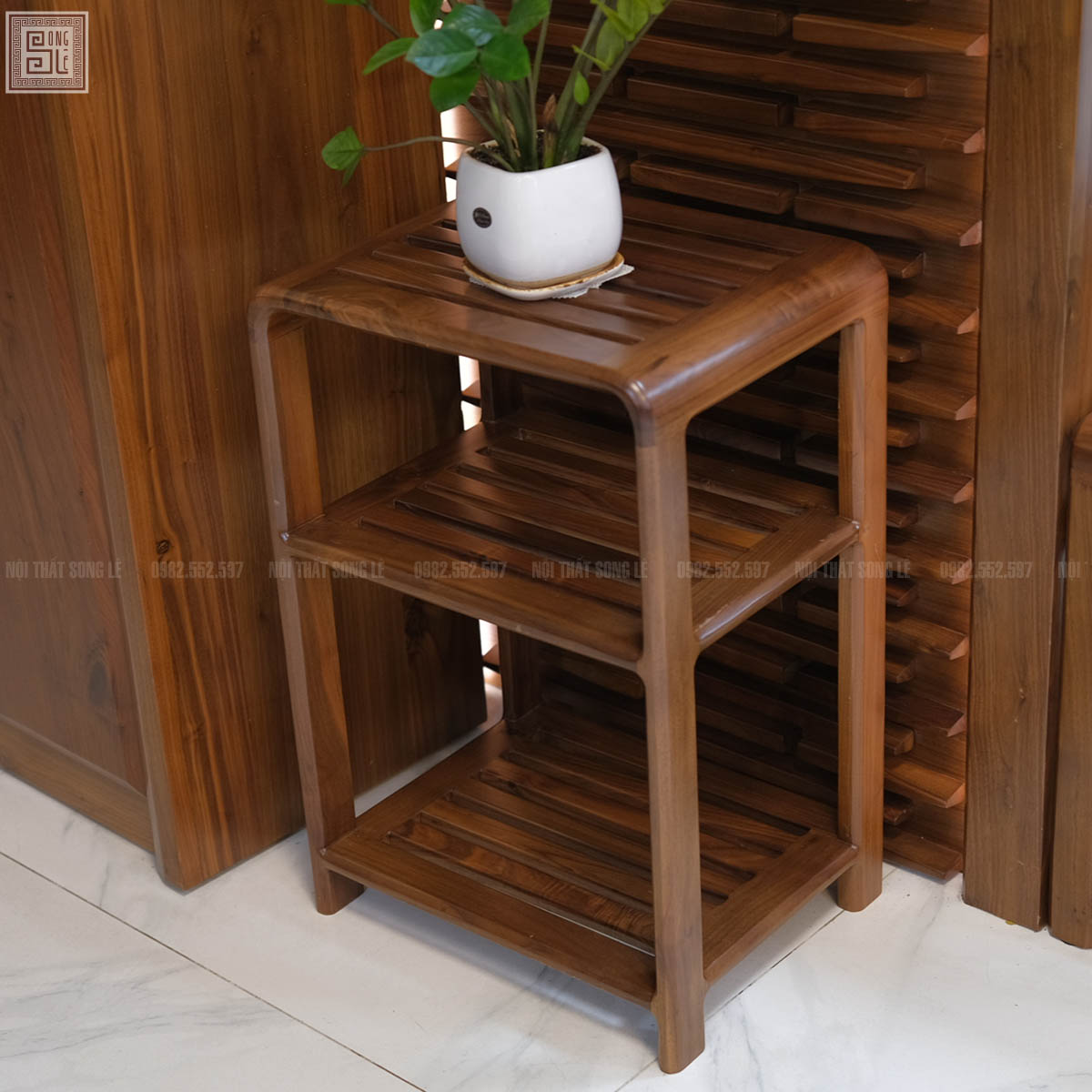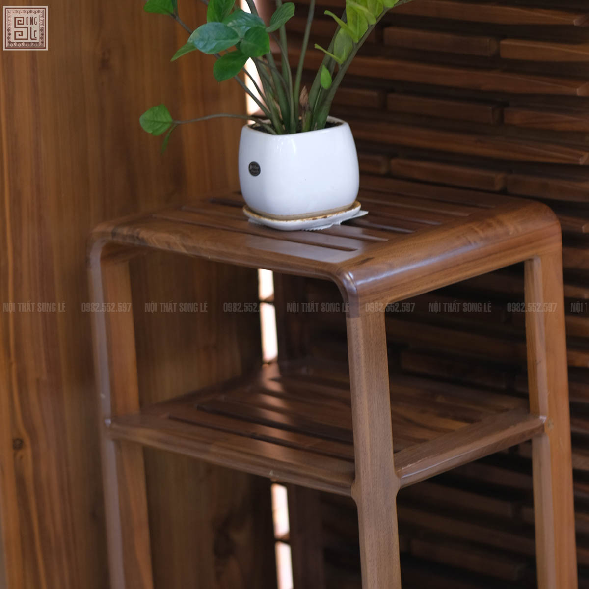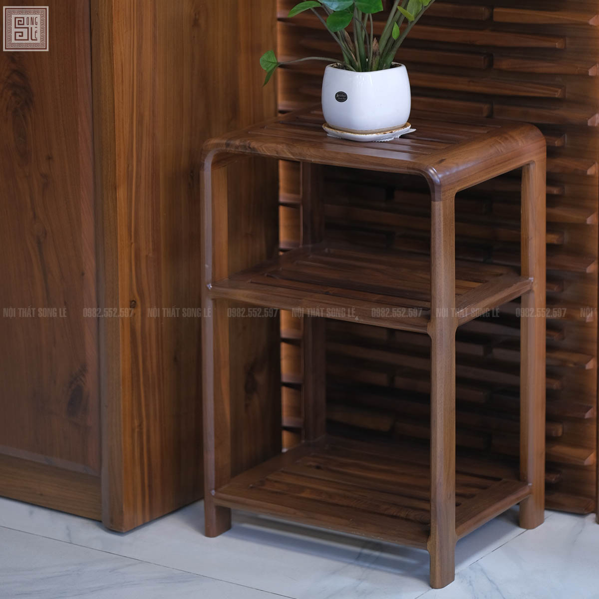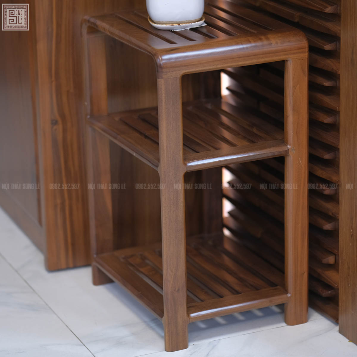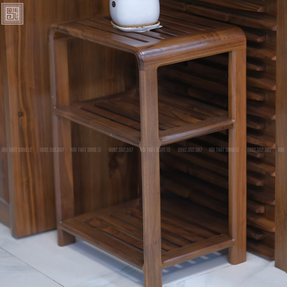 Điểm mạnh đầu tiên của sản phẩm chính là chất liệu gỗ óc chó bền đẹp, có khả năng chống cong vênh, mối mọt và chịu lực tốt, đảm bảo tuổi thọ lâu dài. Thiết kế nan thoáng tạo cảm giác nhẹ nhàng nhưng vẫn chắc chắn, phù hợp với nhiều phong cách nội thất từ hiện đại, tối giản cho đến tân cổ điển. Với hai tầng tiện dụng, kệ giúp phân chia không gian trưng bày khoa học, tăng tính thẩm mỹ và sự tiện lợi trong sinh hoạt. Đây không chỉ là một món đồ nội thất đơn thuần mà còn là một chi tiết trang trí góp phần nâng tầm không gian sống.