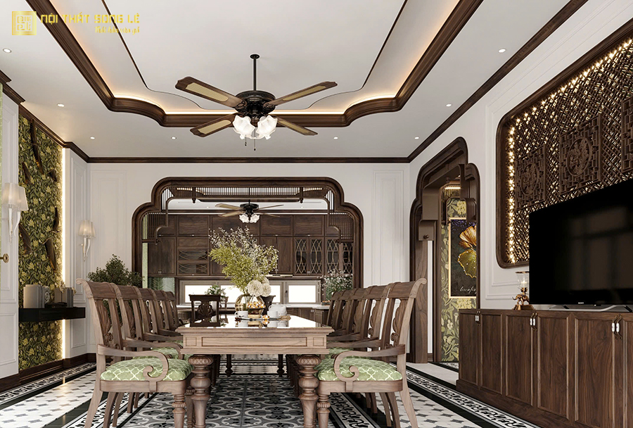 - Vật liệu: Gỗ óc chó là lựa chọn lý tưởng cho tủ, bàn ghế, vách ngăn. Khi dùng gỗ tự nhiên, không gian Indochine trở nên ấm cúng và gần gũi hơn, đồng thời giữ được tính cổ kính. Song Lê với kinh nghiệm trong nội thất gỗ óc chó có thể chế tác các chi tiết Indochine rất khéo léo.