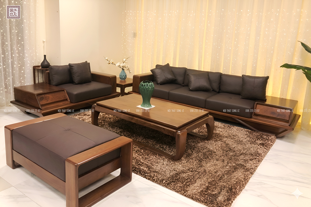 Chưa kể tới, đi kèm với chất liệu chính là gỗ óc chó tự nhiên nhập khẩu từ Mỹ, bộ sofa độc đáo này này còn có sự góp mặt của đệm bọc da tự nhiên, phụ kiện cao cấp từ hafele, hậu ngăn kéo là MDF chống ẩm An Cường bền bỉ. Tất cả tạo nên bộ sản phẩm sang trọng, lịch lãm và chất lượng.