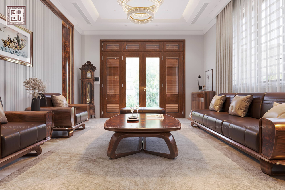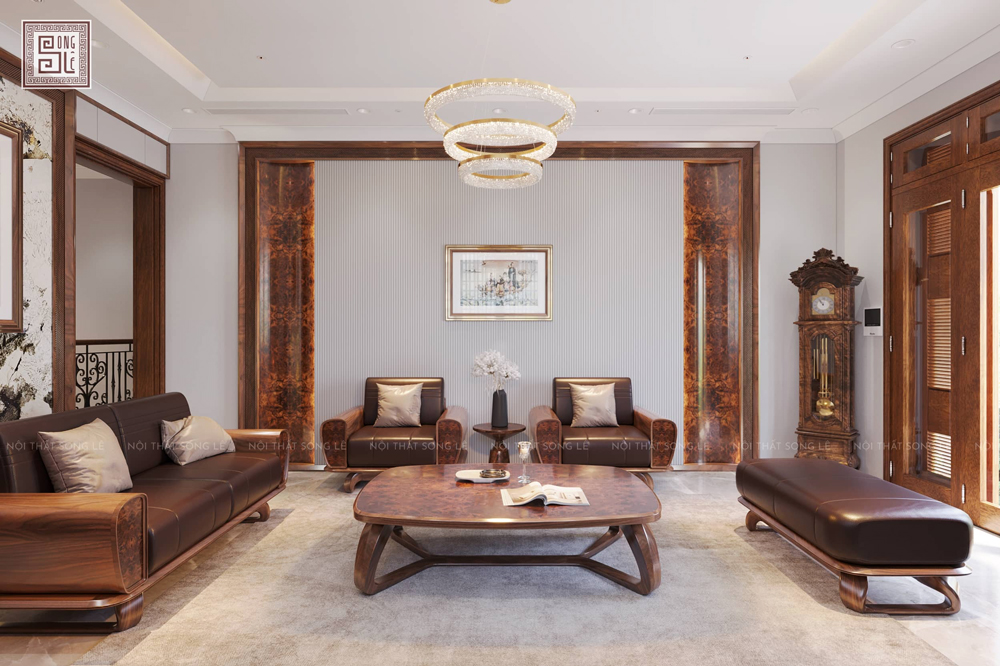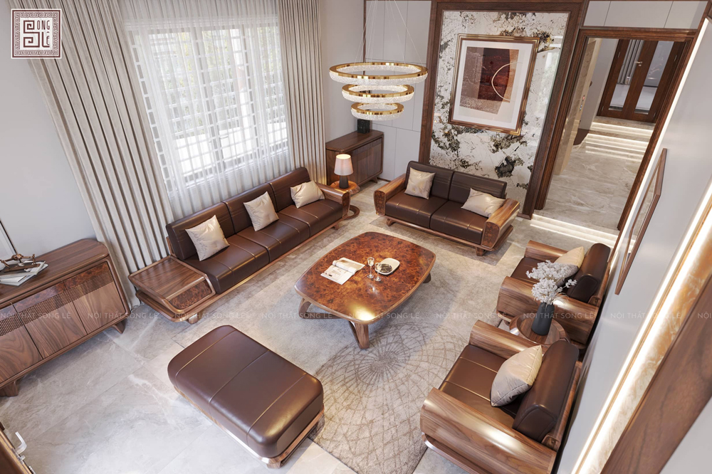 Bộ sofa gỗ óc chó Song Lê được thiết kế theo bố cục khoa học, phù hợp với nhiều không gian phòng khách hiện đại.