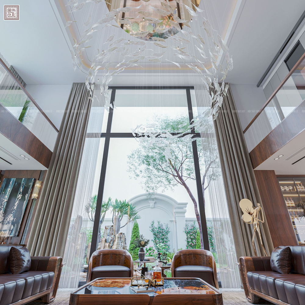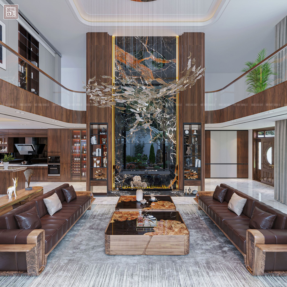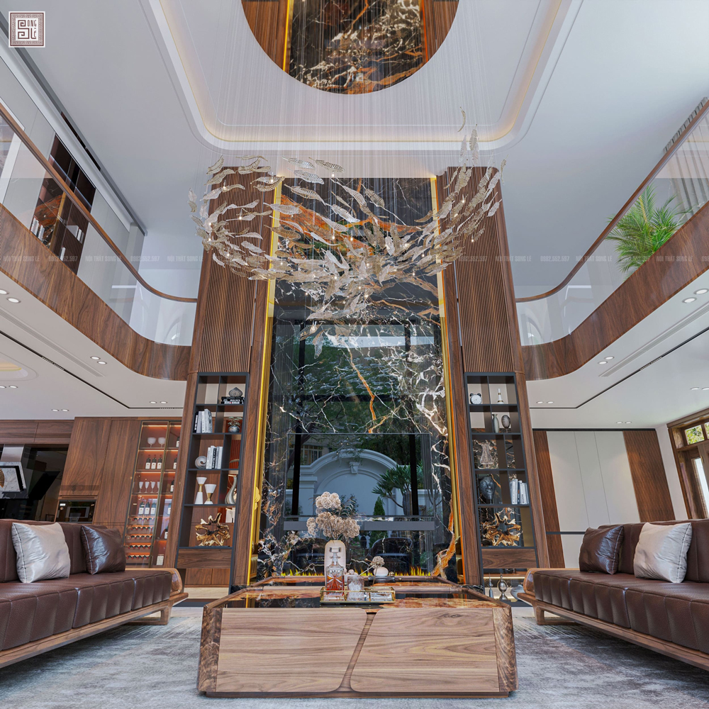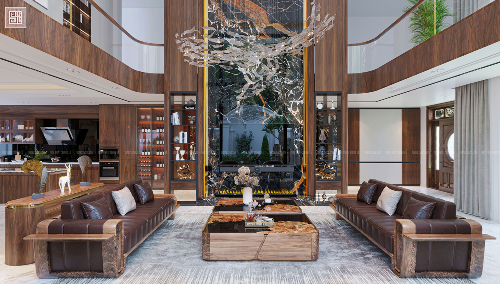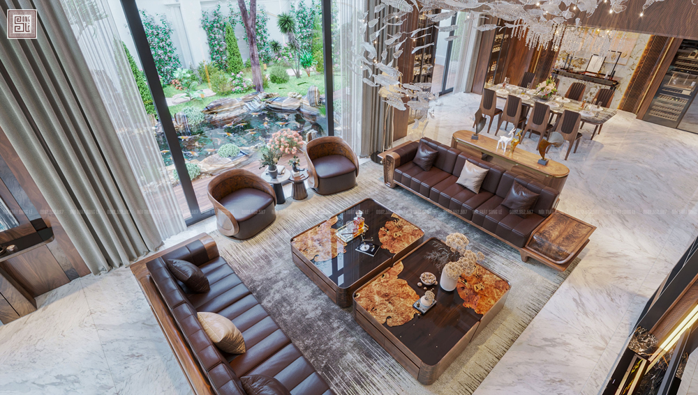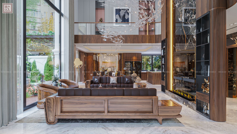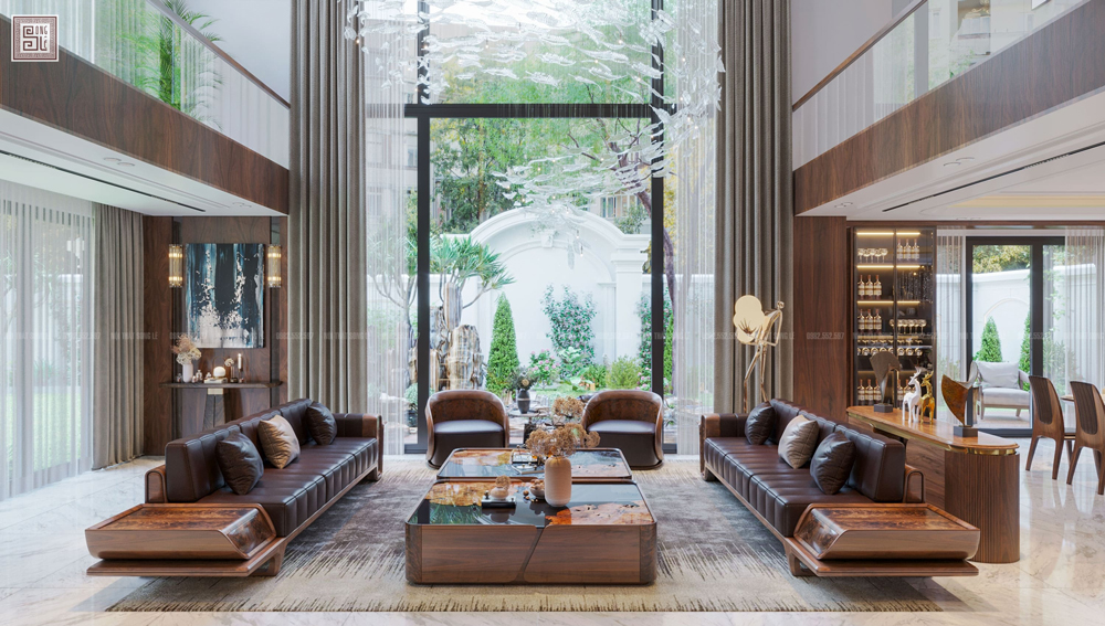 Điểm ấn tượng đầu tiên khi bước vào phòng khách chính là sự sắp xếp rất cân đối của bộ sofa gỗ óc chó sang trọng SLSF031.
