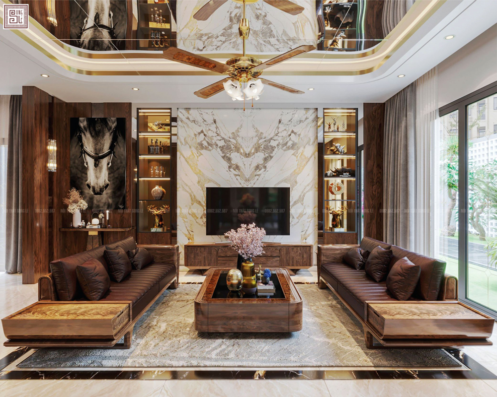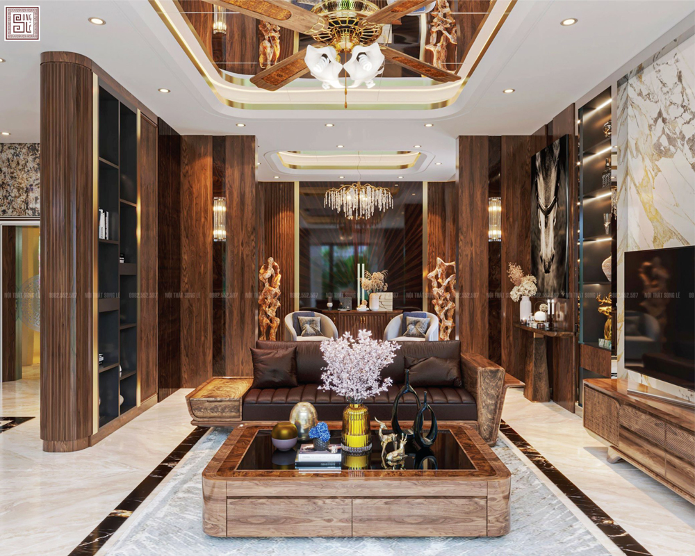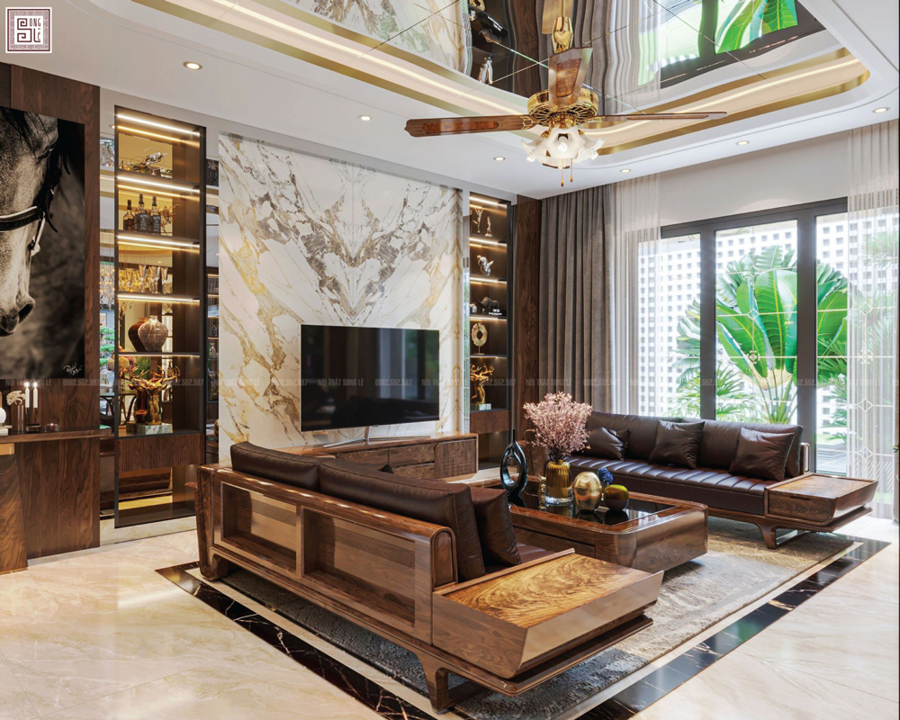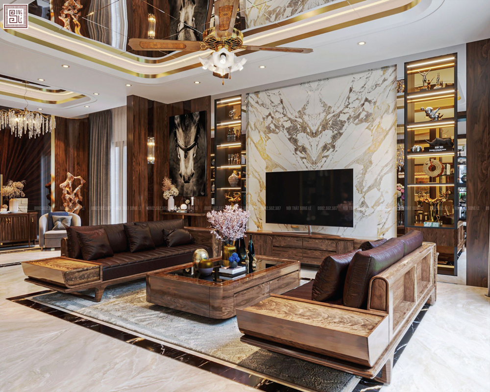Điểm nhấn ấn tượng nhất của bộ sofa gỗ óc chó SLSF033 là thiết kế đối xứng tuyệt đối. Hai băng ghế sofa dài được đặt song song, hướng vào nhau qua tâm điểm là chiếc bàn trà, tạo nên một không gian ấm cúng, sang trọng.