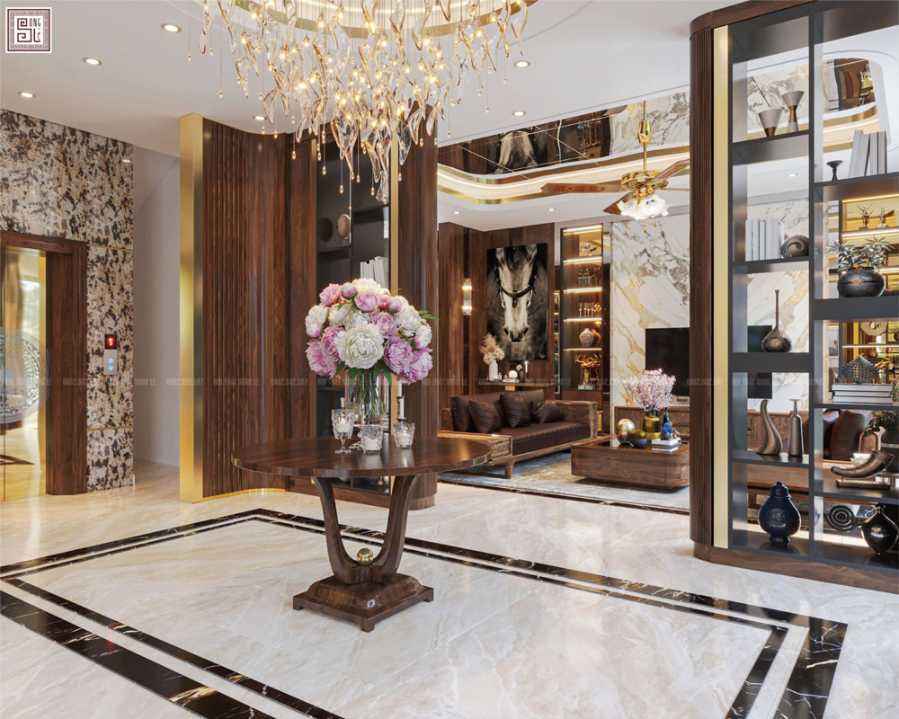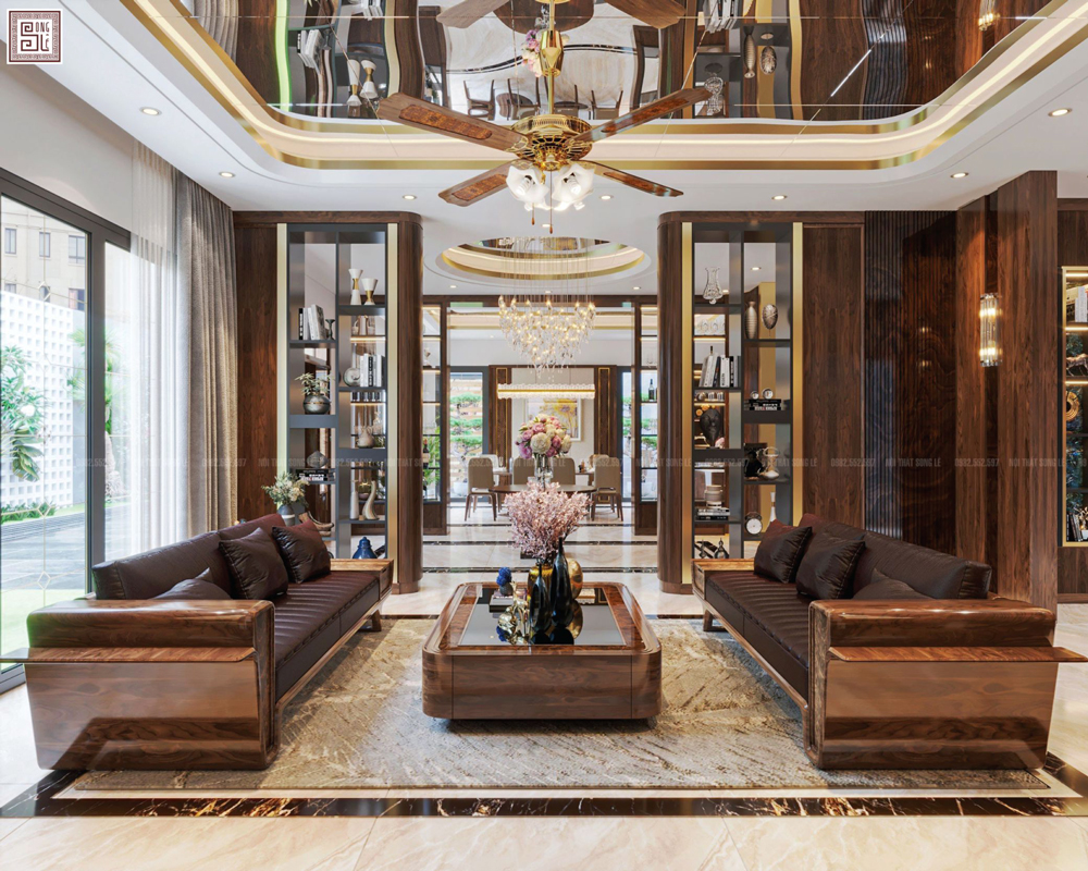 Để hoàn thiện không gian phòng khách tổng thể thì sự đồng bộ trong thiết kế là yếu tố then chốt, bàn trà gỗ óc chó dạng khối vững chãi với mặt kính đen huyền bí. Phía sau, kệ tivi gỗ óc chó kịch trần kết hợp cánh kính và đèn LED âm tủ tạo nên sự mạch lạc trong thiết kế.